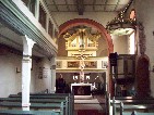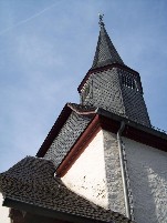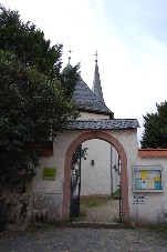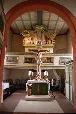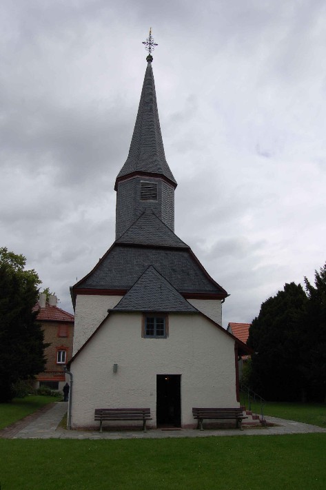 Durch den 1716 errichteten Eingangsbau betritt der Besucher die Kirche, hier trägt auch das Kirchdach den Spitzhelmdachreiter mit seinen 2 Glocken. Die neue Orgel , 13 Register mit 874 Pfeifen, an der gegenüberliegenden Seite der Kirche trohnt gewaltig auf einer Empore über dem Kruzefix von 1760, das der Holzbildhauer Joh. Paul Eckard aus Darmstadt fertigte. Der barocke Orgelprospekt wurde aus der alten Orgel verwendet, die Orgelempore stammt von 1753.